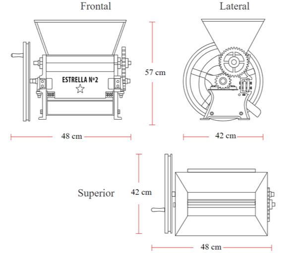 El cilindro, pechero, cureñas, engrane, polea, piñones y chapetas son fabricados en hierro colado, inmunes a la corrosión. Tolva, guarda de pulpa y babero en acero inoxidable. Cumple con norma ICONTEC 2090. El pechero es torneado con ajuste perfecto y cuenta con sistema de graduación, transmisión por piñones fundidos y fresados, completamente silenciosas y precisas, sus cureñas cerradas evitan la fuga de pulpa. Únicas con chumaceras de flanche en el eje del alimentador y el eje del cilindro.
