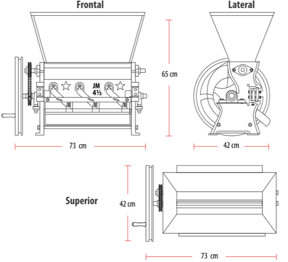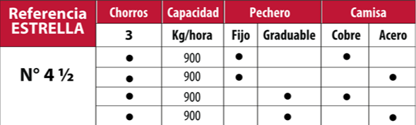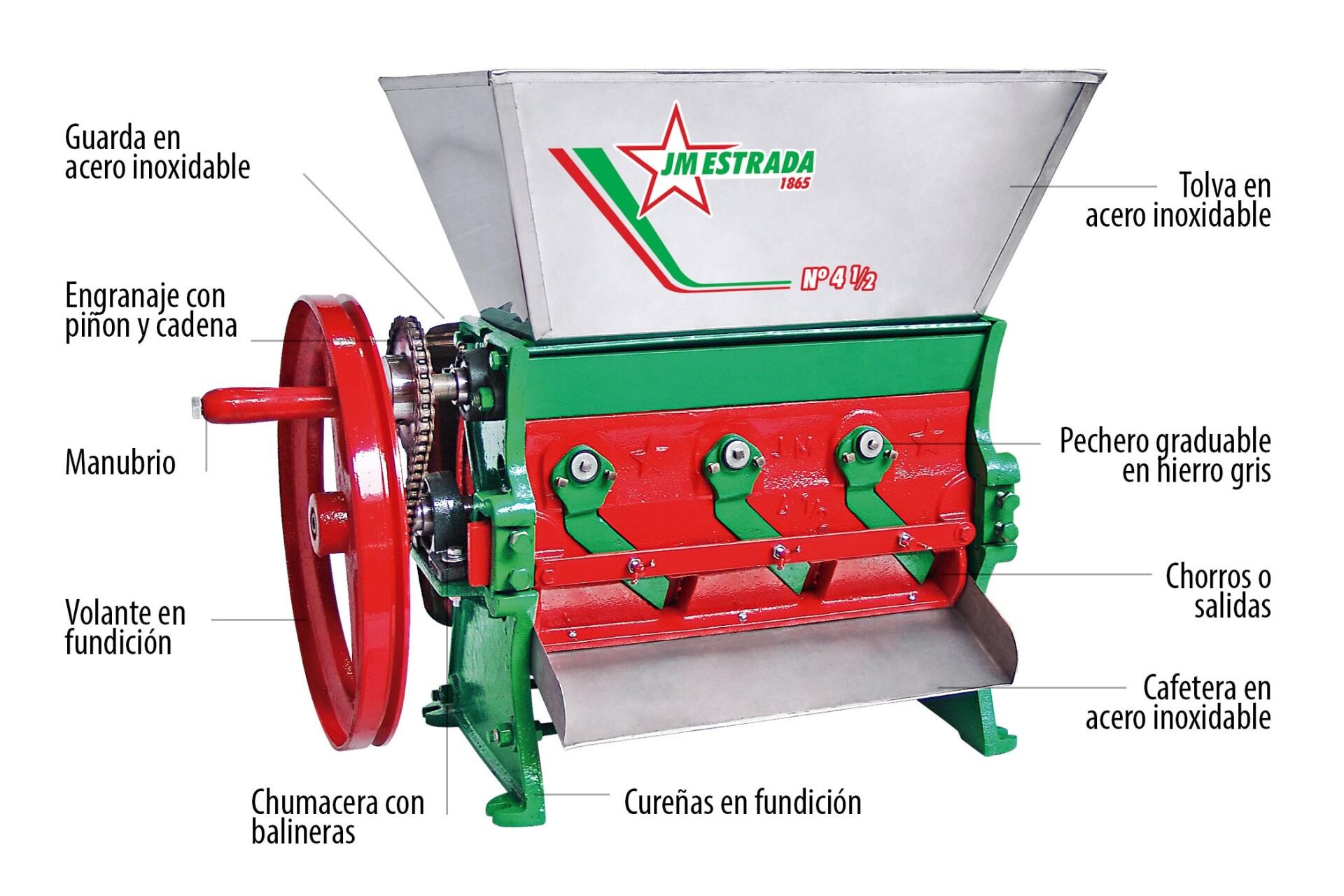 La Despulpadora N°4½ cuenta con el cilindro, pechero, cureñas, engrane, polea, piñones y chapetas son fabricados en hierro colado, inmunes a la corrosión. Tolva, guarda de pulpa y babero en acero inoxidable. Cumple con norma ICONTEC 2090. El pechero es torneado con ajuste perfecto y cuenta con sistema de graduación (con ajuste de canal independiente para la versión de pechero graduable), transmisión por piñones fundidos y fresados, completamente silenciosas y precisas o sistema de sproket (piñón y cadena), sus cureñas cerradas evitan la fuga de pulpa. Únicas con chumaceras de flanche en el eje del alimentador y el eje del cilindro.