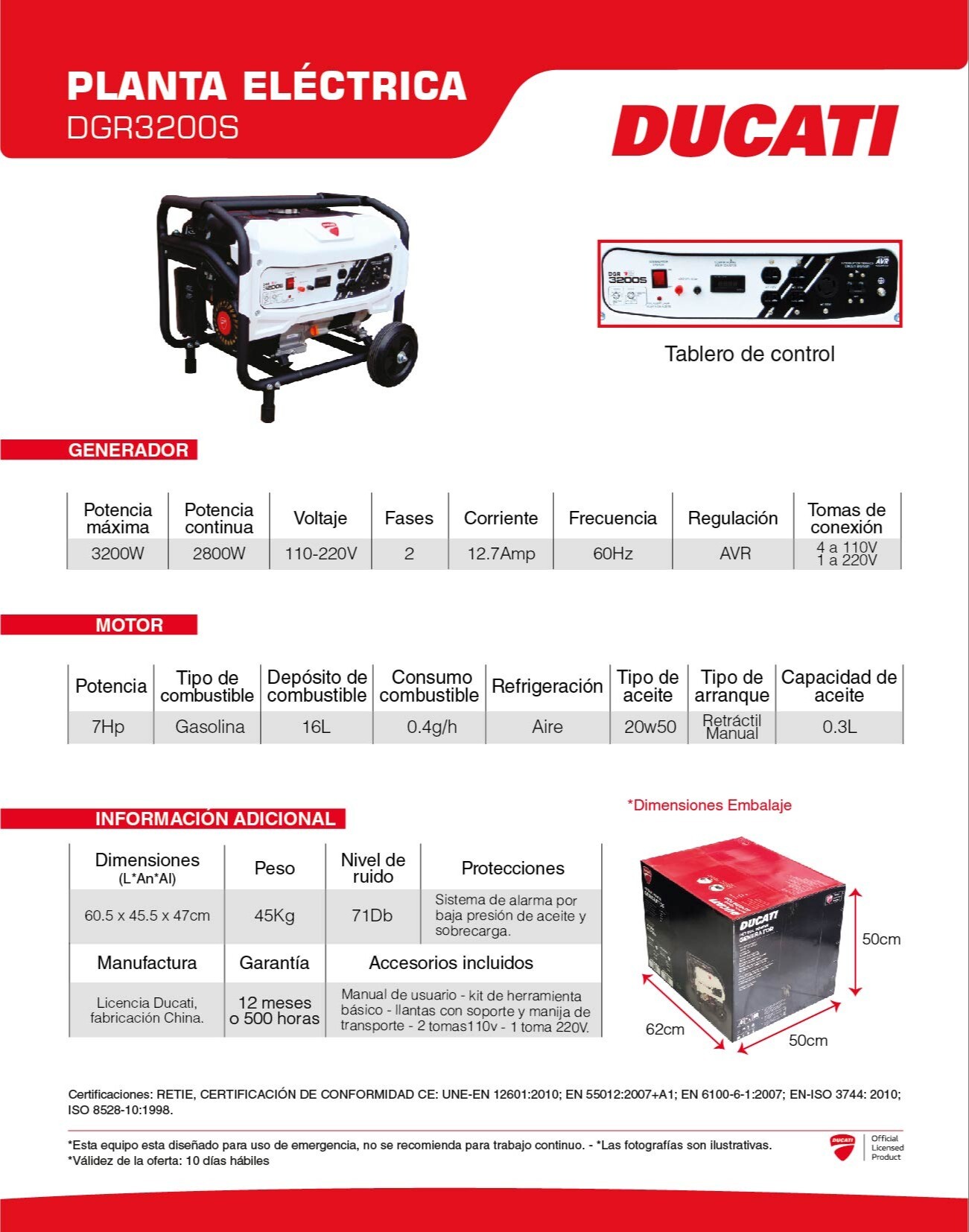 | Garantía | 12 meses 0 500 horas de trabajo |