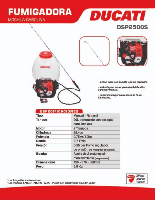 La fumigadora Ducati está diseñada pensando en la comodidad del operador. Cuenta con un asa ergonómica y ajustable que facilita su transporte y manejo, reduciendo la fatiga durante largas sesiones de trabajo. Además, está equipada con una correa de hombro acolchada que distribuye el peso de manera uniforme, proporcionando una mayor comodidad y equilibrio.