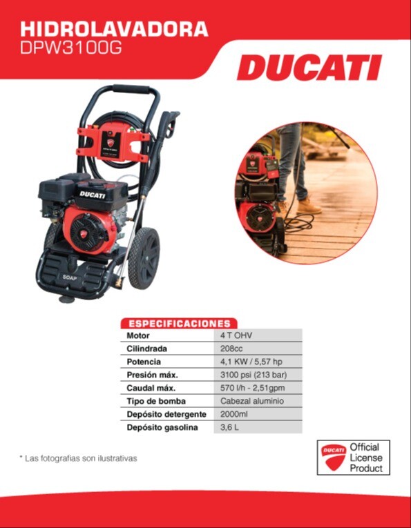 Hidrolavadora Ducati Gasolina 3.100PSI, DPW3100G, de alta presión, robusta y altísimo rendimiento con motor gasolina de 4T 7.0 hp y bomba Coaxial de aluminio, su estructura tubular metálica con ruedas solidas de gran resistencia que facilita sus desplazamientos, mantenimiento mínimo, el equipo ideal para aplicaciones de gran exigencia con alto rendimiento, pistola, lanza y juego de boquillas de varios ángulos de aspersión el mas completo equipo de lavado de alta presión.