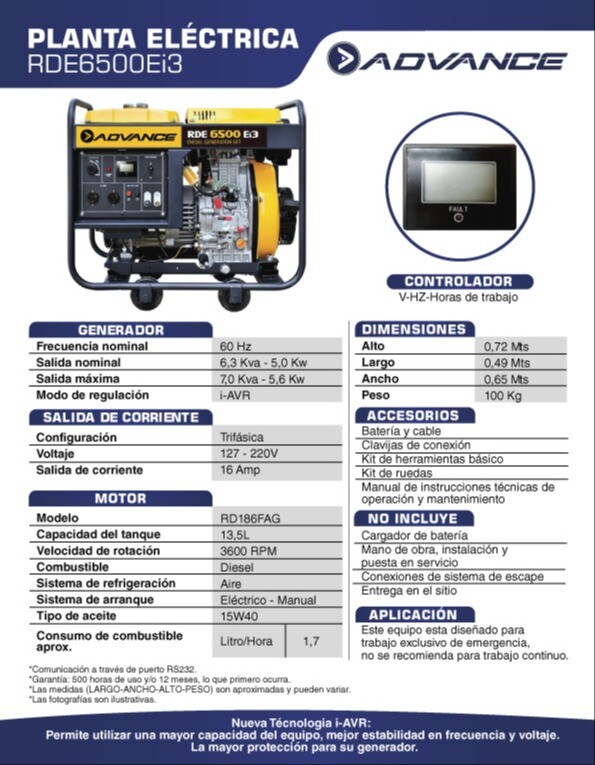Es un equipo para uso exclusivo de emergencia, tiene una tarjeta inteligente i-AVR la cual le permite a la máquina soportar picos de salida superiores a su capacidad nominal hasta un 10% más. Advance envía un voltaje estable, fuerte, confiable y duradero, es el equipo ideal para realizar sus actividades.