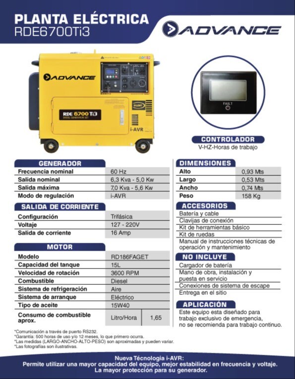Además, incluye: clavijas de conexión, batería y cable, kit de ruedas para facilitar su traslado, kit de herramientas básico.