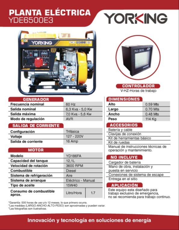 Gracias a su configuración trifásica permite que diferentes equipos que manejen este tipo de corriente sean ensamblados sin ningún inconveniente y den su máximo rendimiento, además, incluye KIT ruedas para facilitar su movimiento o traslación, batería y cable, clavijas de conexión, es decir, accesorios que optimizan su uso y rendimiento.