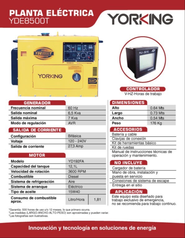 Incluye un KIT de herramientas básico, clavijas de conexión, KIT de ruedas para facilitar su movimiento y una cabina para mitigar la emisión de ruido. Tiene todos los implementos para una óptima función.